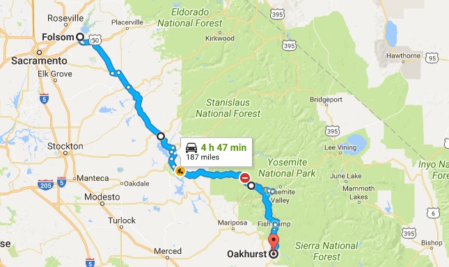 | Map of Folsom, CA to Oakhurst, CA (source: Google Maps) |